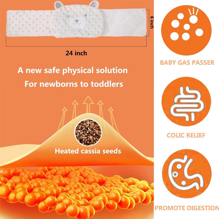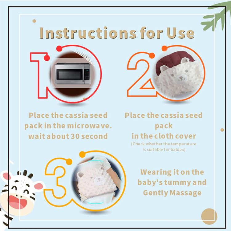 - 2 Gripe belt for babies is in animal shape, cute cassia heating bag hope it can divert your baby’s attention from colic and flatulence, help to relieve your baby’s colic and flatulence discomforts, and allow your baby to sleep more soundly.