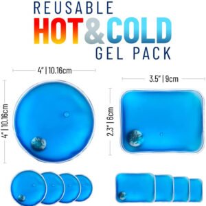 - HANDS FREE DESIGN & LONG LASTING WARMTH: Our reusable hot cold packs come in a set of 10, 5 Round (4” diameter) & 5 Rectangle (4.7” x 3.2”); two extra fabric pockets with straps are included to hold the pad in place for hands-free usage, and to provide longer lasting heat therapy
