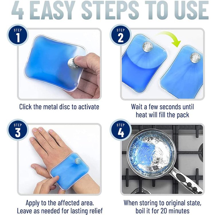 - REUSABLE & SAFE: Our snap heat pads contain sodium acetate (vinegar and baking soda) & water; non-toxic and latex-free PVC casing; To reset a heat pack, boil it for around 5-10 min or until all crystals dissolved and the gel appears clear again, let it cool to room temperature and it’s now ready to be re-activated again by snapping the metal piece